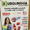 Cartel publicitario de academia de idiomas en la Universidad de Santiago de Compostela, con palabras en castellano, gallego e inglés.